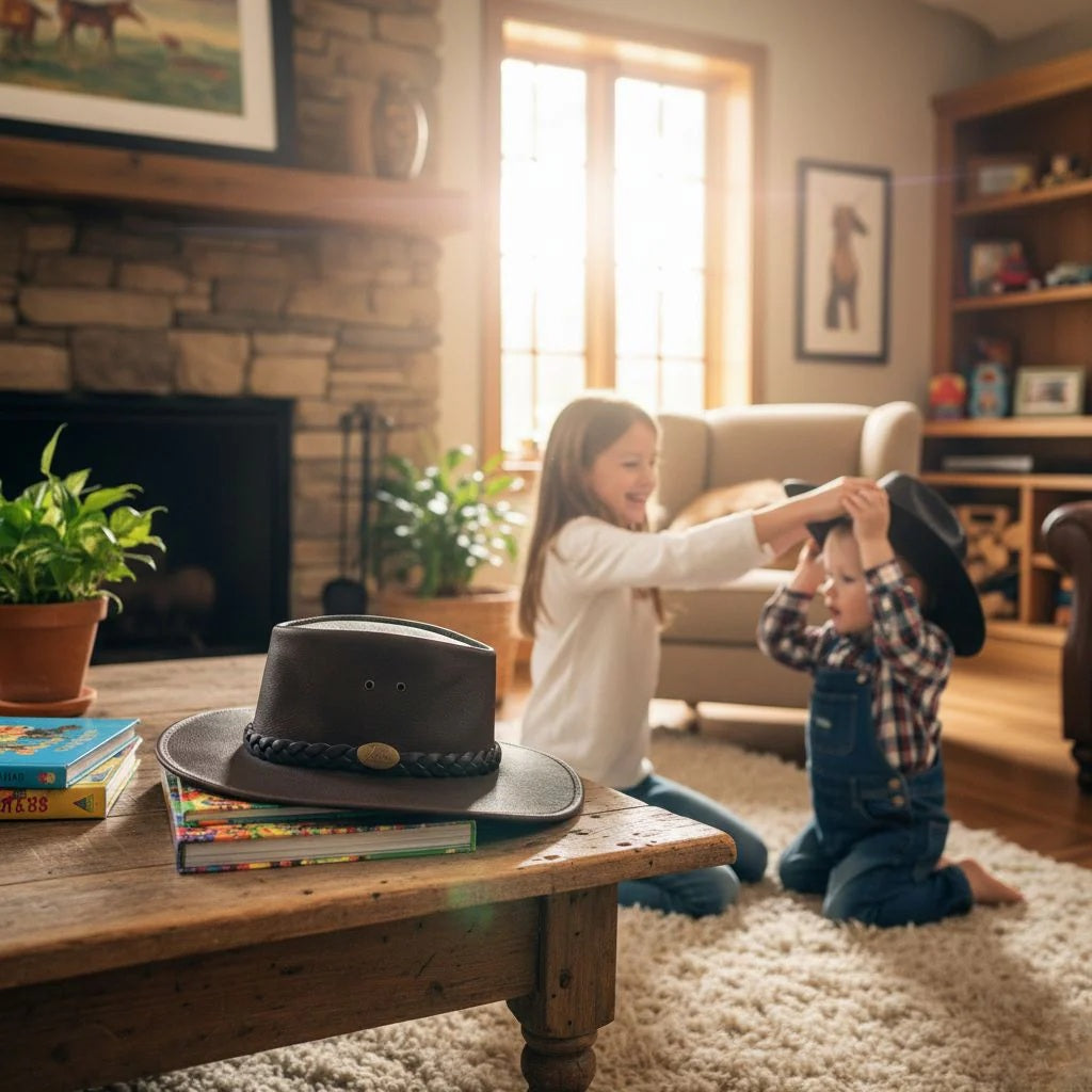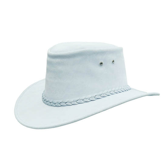 Der Australian Kids Cowboy Hat ist ein robuster Allwetter-Cowboyhut für Kinder, gefertigt aus weichem, hochwertigem Wildleder in hellblau. Das langlebige Leder schützt zuverlässig bei Wind und wechselhaftem Wetter und bietet gleichzeitig einen bequemen, formstabilen Sitz.